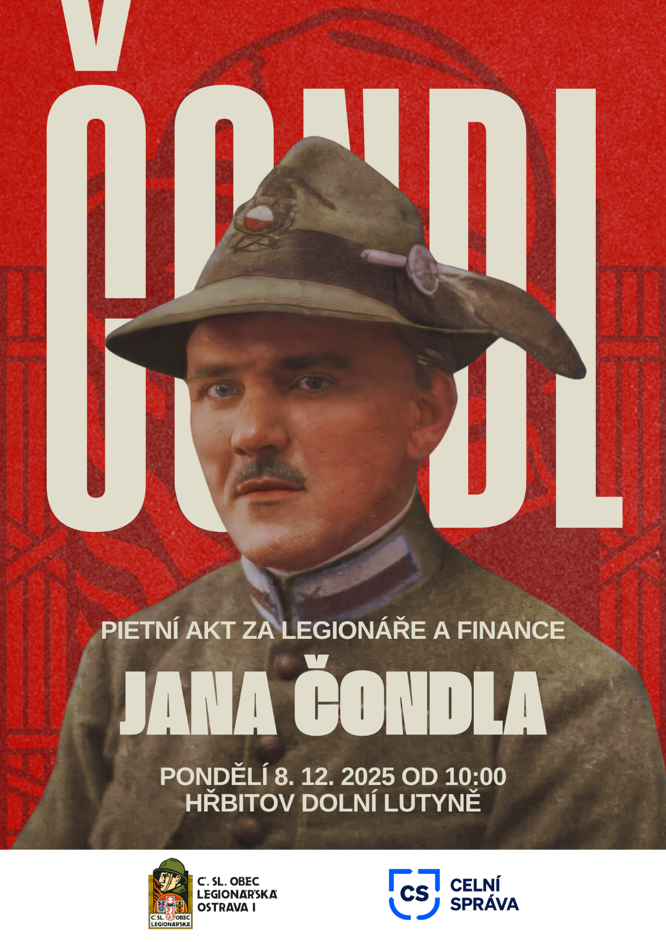 Srdečně spolu s Celním úřadem v Ostravě zveme veřejnost k již tradiční pietní vzpomínce na italského legionáře a strážmistra finanční stráže Jana Čondla, která se letos uskuteční v předvečer 104. výročí jeho tragické smrti, a to v pondělí 8. prosince 2025 od 10:00 hod. na hřbitově při kostele sv. Jana Křtitele v Dolní Lutyni.